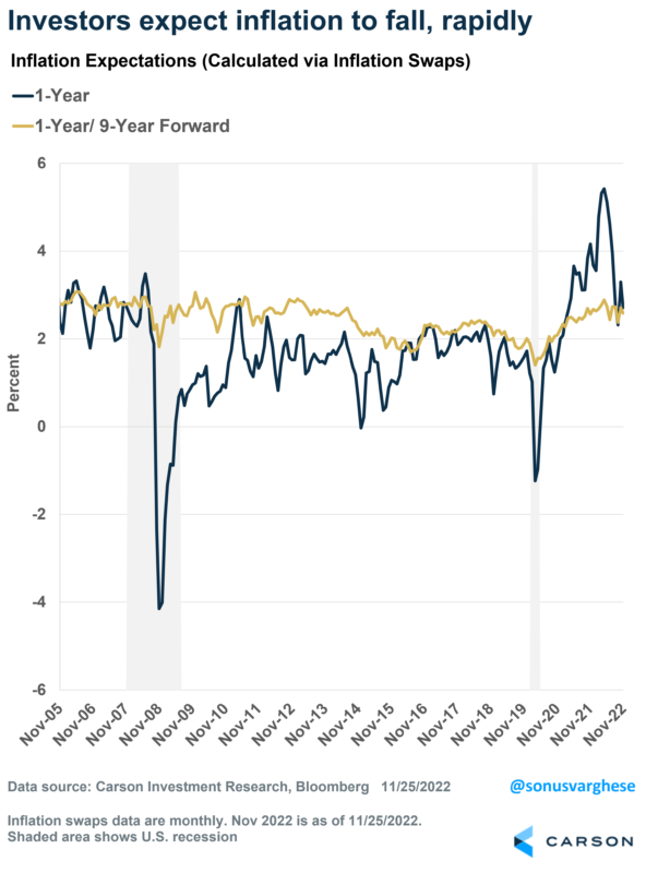 But, longer-term inflation expectations can also be lower than short-term inflation expectations if inflation has surged recently and investors believe it to be a short-term phenomenon. Sound familiar?